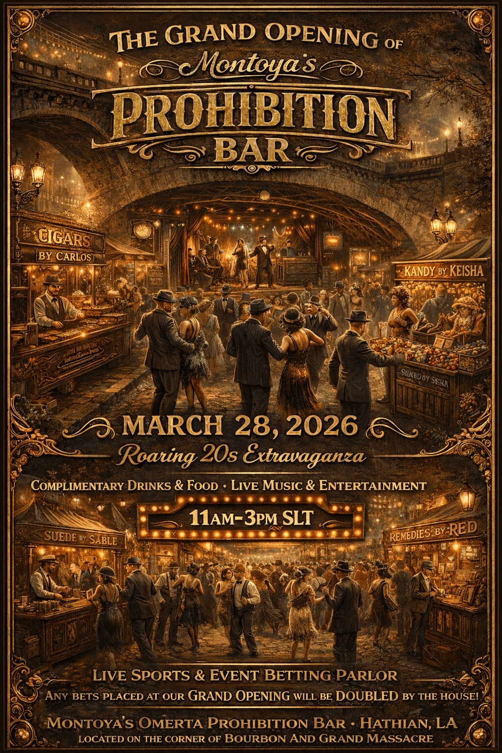 Slip back into a time with the bootlegged drinks flowed as strong as heavy as the music! Montoya’s Omerta Prohibition Bar celebrates its GRAND OPENING on March 28, 2026 from 11am to 3pm SLT. Located at the corner of Bourbon and Grand Massacre, at the edge of the Red Light District! The bar will bring the Roaring 20’s alive and out into the street and under the bridge! Come join us for free dangerous drinks, delightful eats and dance the night away with celebrity entertainment! Take a trip, speak-easy style, and investigate the gaming parlor. Any bets placed during the Grand Opening, will be matched by the House! This is an IC event and will adhere to the Montoya’s Omerta Code!