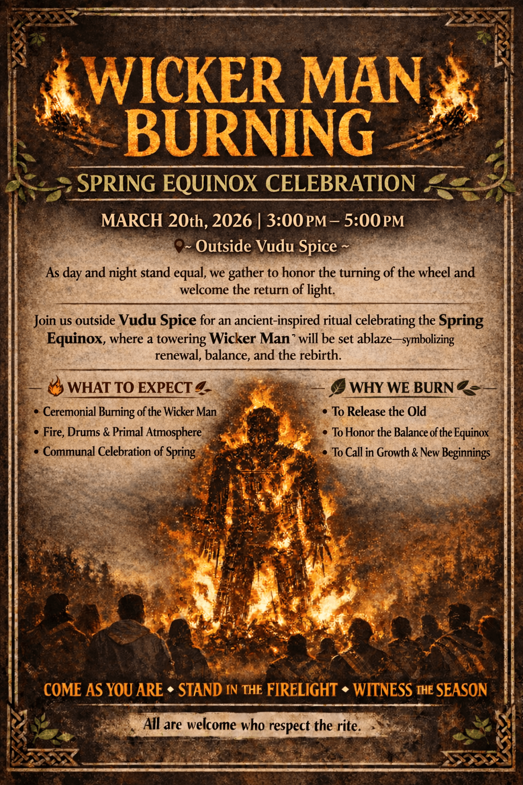 🔥 WICKER MAN BURNING 🔥🌱 SPRING EQUINOX CELEBRATION 🌱 March 20th, 2026🕐 3:00 PM – 5:00 PM As day and night stand equal, we gather...