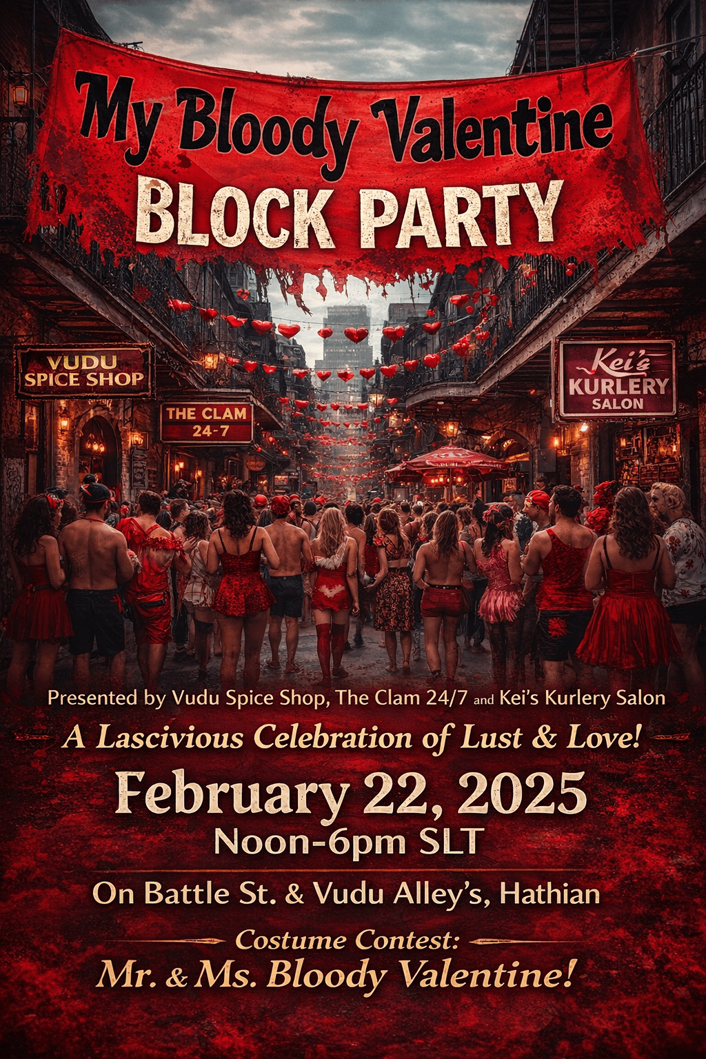 The Vudu Spice Shop, The Clam and Kei's Beauty Salon presents... My Bloody Valentine Block Party! Let's celebrate Lascivious Lust & Love! Come join us...