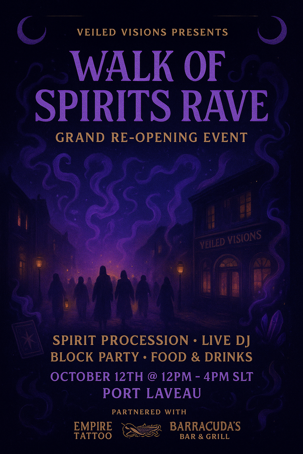 a Procession through Port Laveau from the Docks to Veiled Visions, ending in a masked Rave block party. Live DJ and music, Food and drinks...